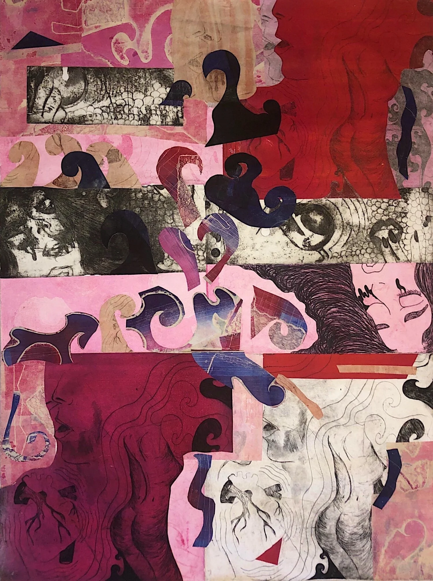 Mixed media collage print using, intaglio hard-ground, aquatint, and drypoint etching. Monotype, collagraph, markers, and paper print scraps used.