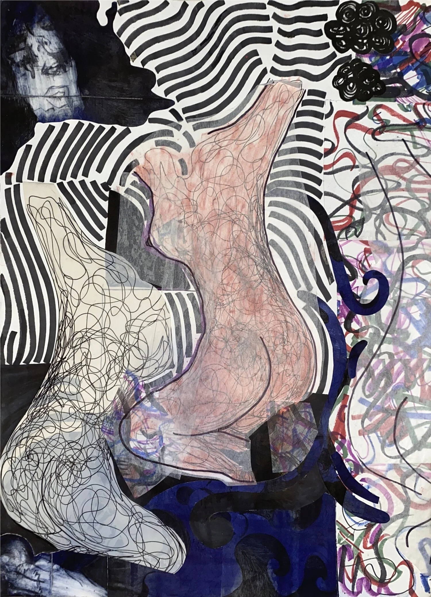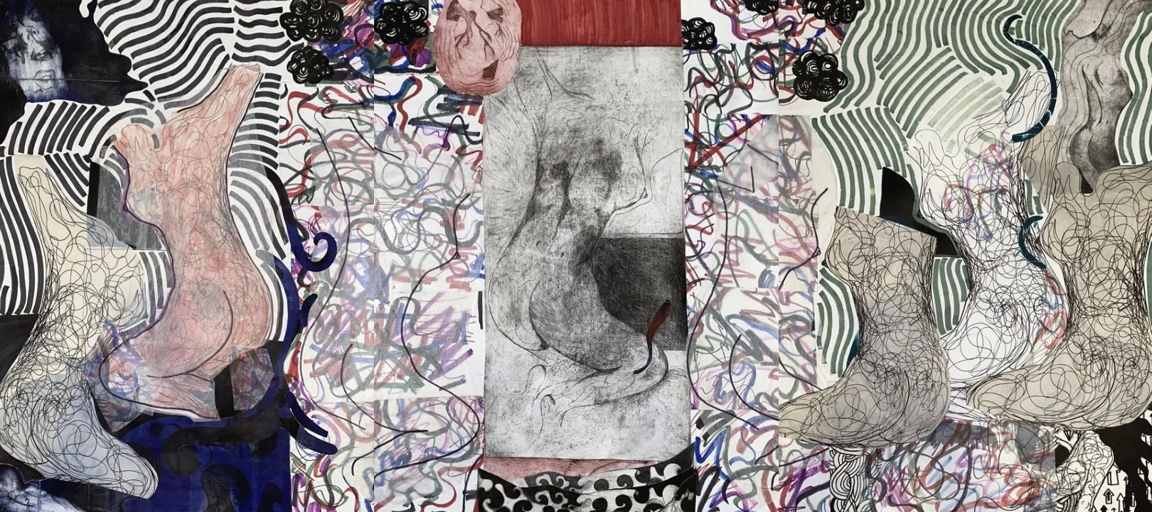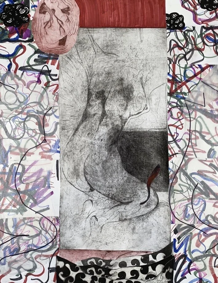 Mixed media collage triptych using, hard-ground, intaglio etching, monotype, collagraph, markers, newsprint, pronto plates, and paper print scraps
